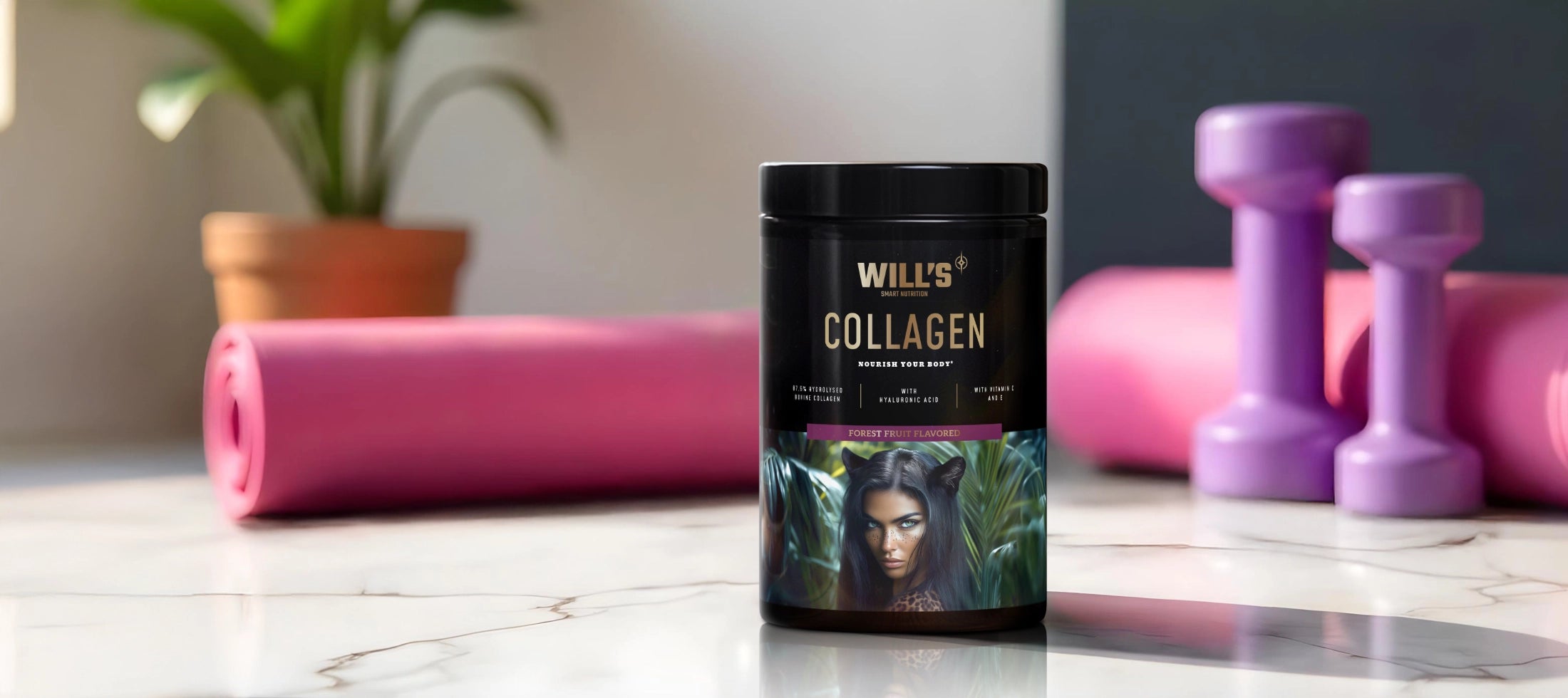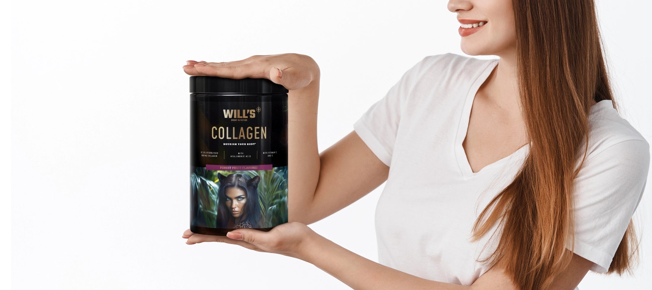 COLLAGEN DRINK POWDER WITH VITAMINS, HYALURONIC ACID AND SWEETENER. FOREST FRUIT FLAVOR.