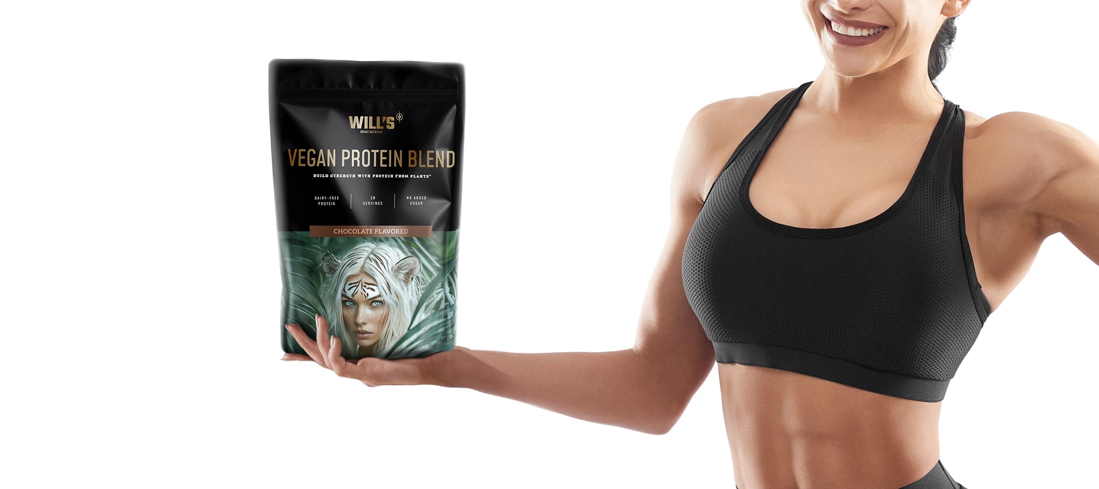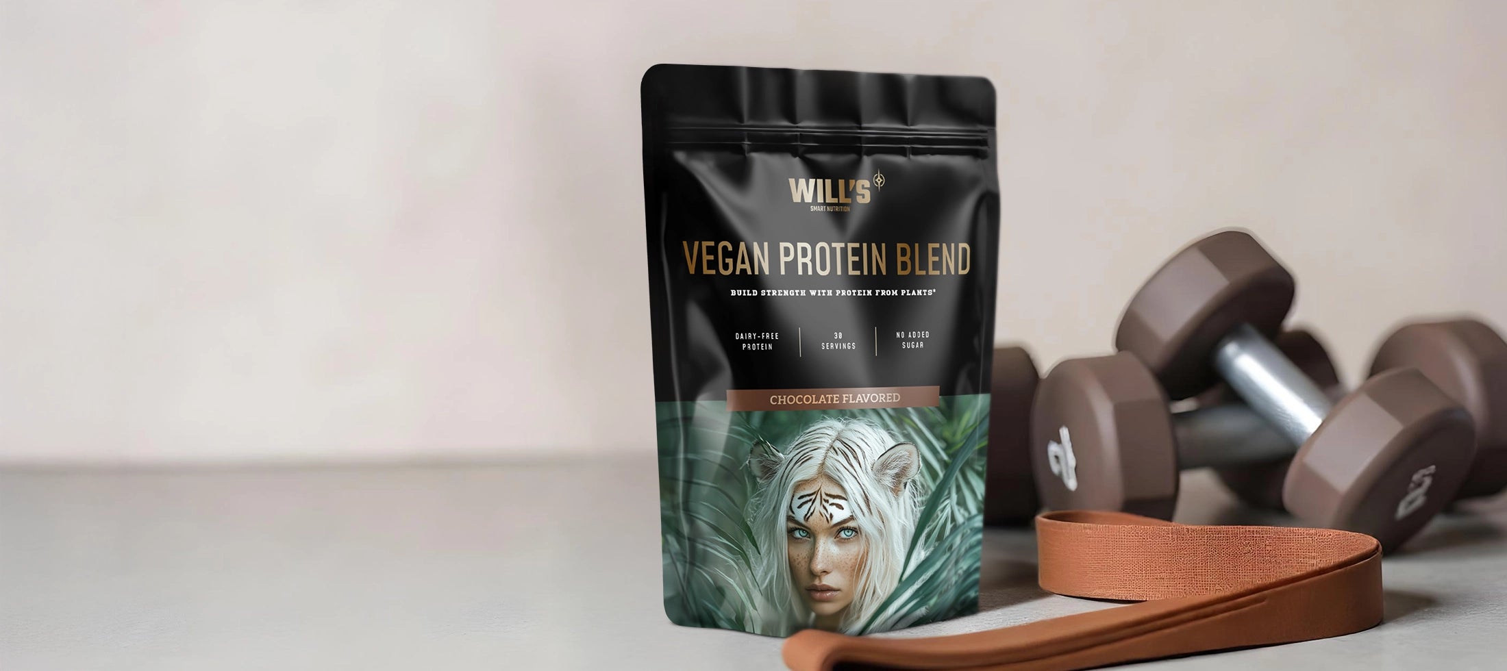VEGAN PROTEIN BASED DRINK POWDER WITH SWEETENER. CHOCOLATE FLAVOR.